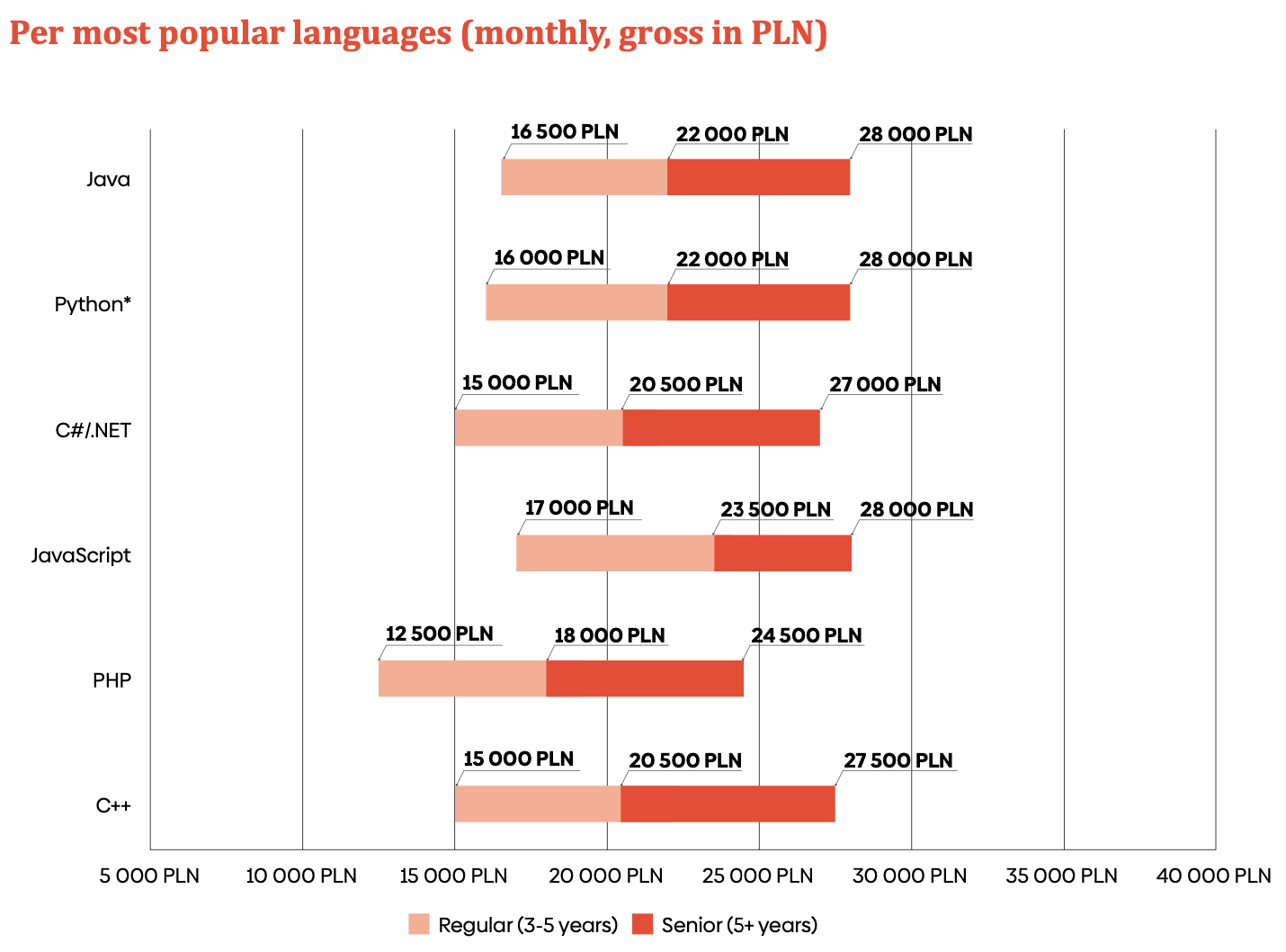 Программист уровня Trainee/Junior может рассчитывать на 5000-7000 злотых (1000-1500 USD). Middle в среднем получает 10000-12000 злотых (2000-2500 USD). Senior/Lead/Architect получает зарплату 14000 - 20000 злотых в месяц (3000 -4500 USD) .
